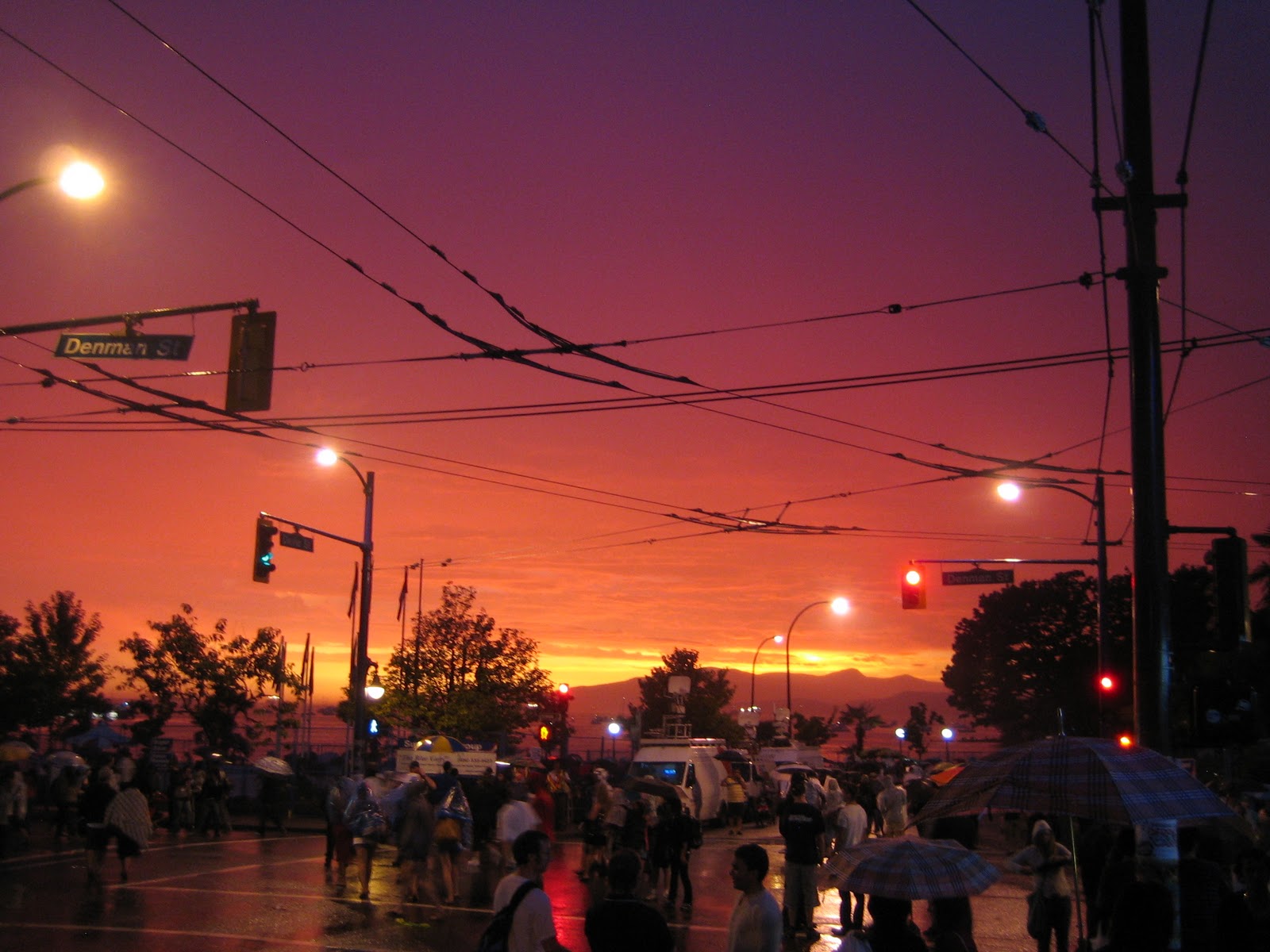 Celebration of Light festival. An annual fireworks festival choreographed to music set off from a barge in the ocean just off English Bay. As famous for the drunken revelry and long journeys back home to the suburbs as it is for the beautiful 35 minute long shows. We watch from our local bar, well away from the madness and crowds below.