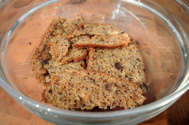 Cut the banana bread into slices and lay in the bottom of a glass dish.